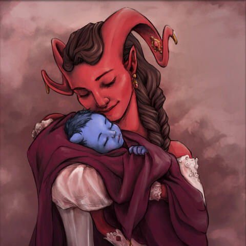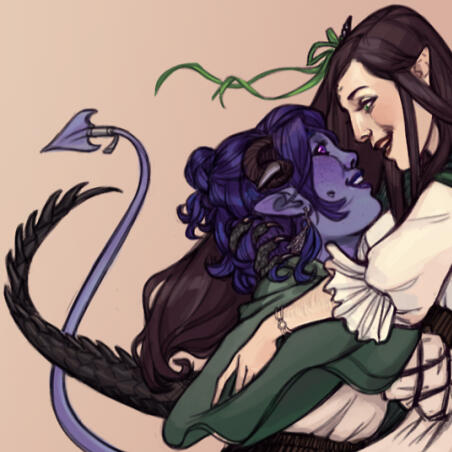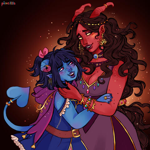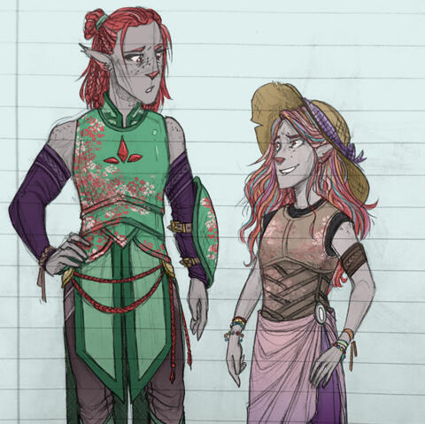 A decade after V, we had a bit of a surprise: twins! Tiefling twins, in fact. Little Olivia Thalia Keyleth de Rolo and Whitney Julia Theresa de Rolo. They were tieflings, dark reddish-purple in color, and had eyes to melt their parents' hearts. Whitney ended up becoming a druid like their aunt Keyleth, while Olivia was a wizard.