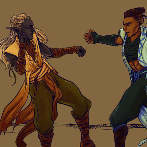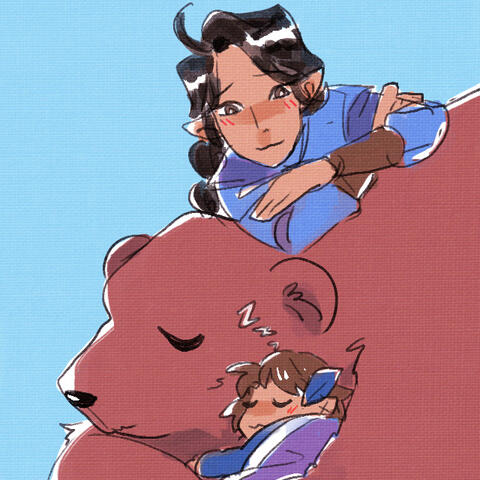 When we traveled and rested with Vox Machina, Vax and I would sleep rested against Trinket. Trinket would buffet us against the elements, Vax would stay in the middle, and I'd be curled on the inside. In emergencies I'd spring up to get my bow and Vax would start throwing daggers.